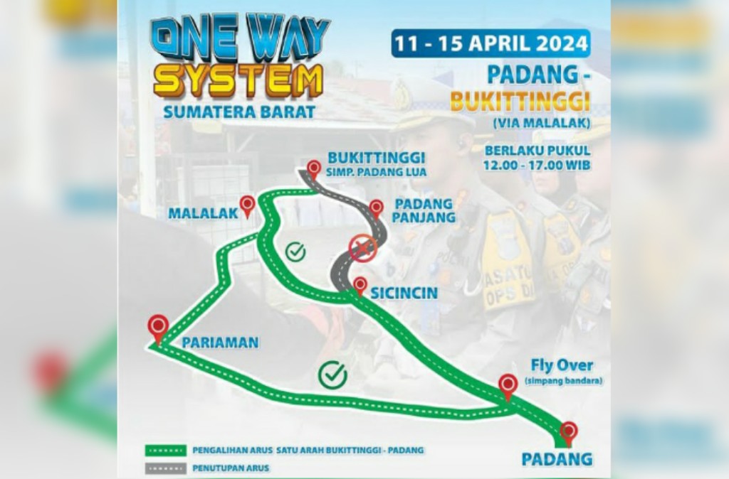 Dilansir dari akun Instagram Ditlantas Polda Sumbar, rute one way untuk periode 11-15 April 2024 berbeda dengan periode sebelumnya: